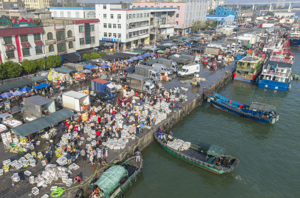 ↑1月13日,海南省文昌市清澜港码头人来车往购销两旺(无人机照片)。新华社发(蒙钟德摄)