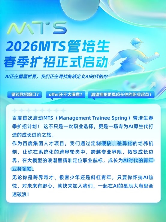1月12日,百度官方宣布,首次启动MTS(Management Trainee Spring)管培生春季扩招计划。据介绍,这是百度顶尖人才计划首次扩招,offer数量将扩增100%。