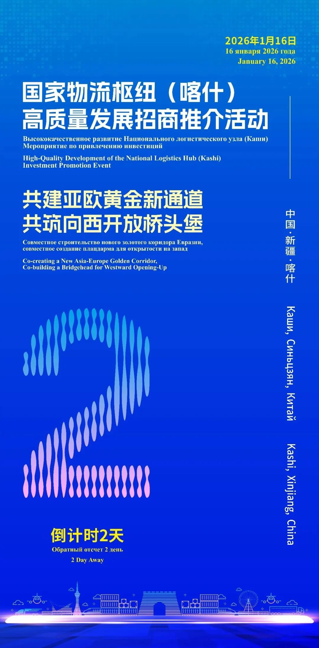 倒!计!时!2!天!国家物流枢纽(喀什)高质量发展招商推介活动主题为“共建亚欧黄金新通道共筑向西开放桥头堡”1月16日即将在喀什重磅启幕!诚邀八方客商、业界翘楚齐聚丝路明珠共探枢纽经济发展新机遇共商向西开放合作新路径携手擘画亚欧商贸往来、产业协同的崭新蓝图!