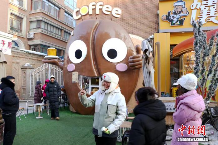 1月12日,在位于乌鲁木齐市的新疆国际大巴扎内,游客在“馕咖啡”摊位前拍照打卡。苟继鹏 摄