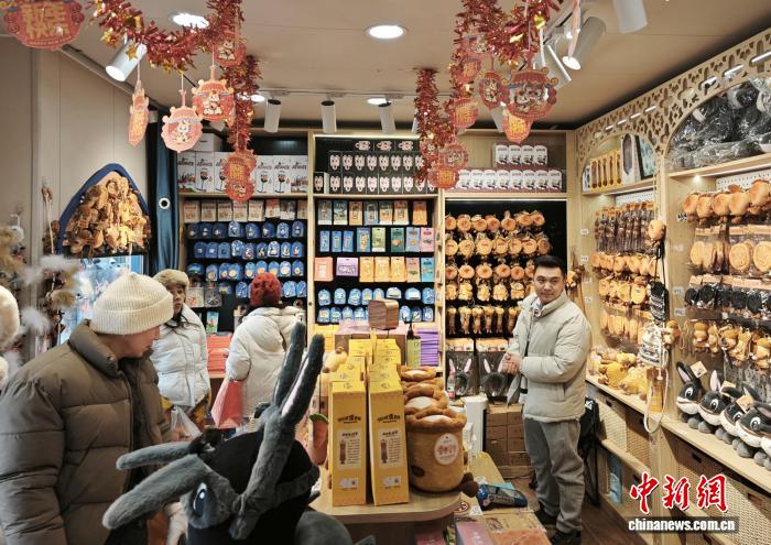 1月12日,在位于乌鲁木齐市的新疆国际大巴扎内,游客在阿凡提文创专卖店挑选商品。苟继鹏 摄