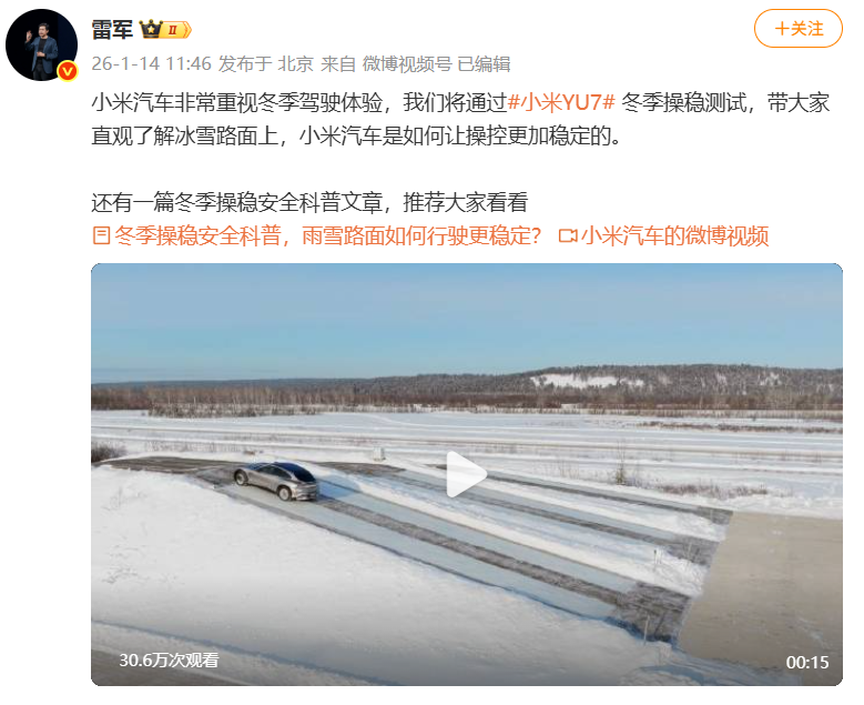 小米汽车表示:小米始终以用户需求为导向,通过持续的电控技术创新与严苛的测试验证,为每一次冬日出行筑牢安全防线,把「冬季行车不慌、操控稳定可靠」的体验,传递给每一位车主。
