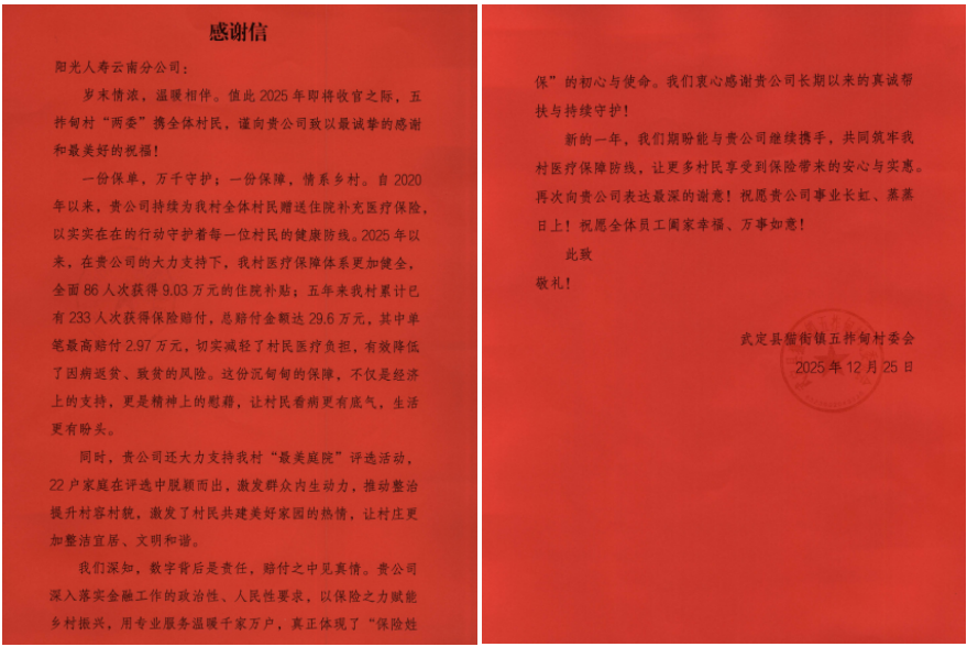信中写道,自2020年以来,阳光人寿云南分公司持续为五拃甸村全体村民赠送住院补充医疗保险,以实实在在的行动守护每一位村民的健康防线。数据印证着这份守护的分量:2025年,该村86人次通过该保险获得住院补贴9.03万元;五年累计赔付233人次,总赔付金额达29.6万元,单笔最高赔付2.97万元。这份“沉甸甸的保障”不仅减轻了村民医疗负担,更有效降低了因病返贫、致贫风险,让村民看病更有底气、生活更有盼头。