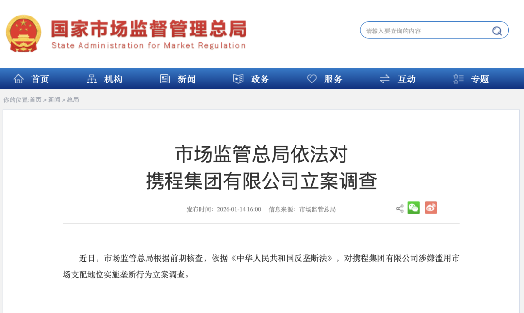 市场监管总局依法对携程集团有限公司立案调查社会与法 | 2026-01-14 20:15:00 微信扫码扫码下载客户端近日,市场监管总局根据前期核查,依据《中华人民共和国反垄断法》,对携程集团有限公司涉嫌滥用市场支配地位实施垄断行为立案调查。责任编辑:王相宜