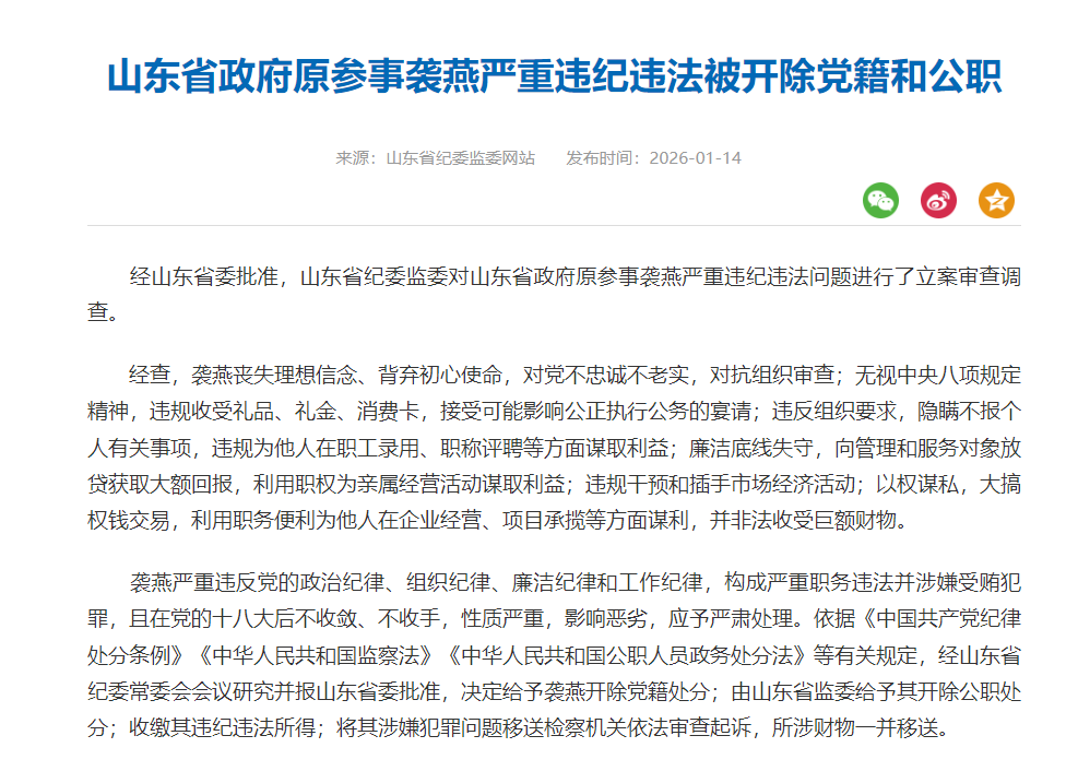 经山东省委批准,山东省纪委监委对山东省政府原参事袭燕严重违纪违法问题进行了立案审查调查。