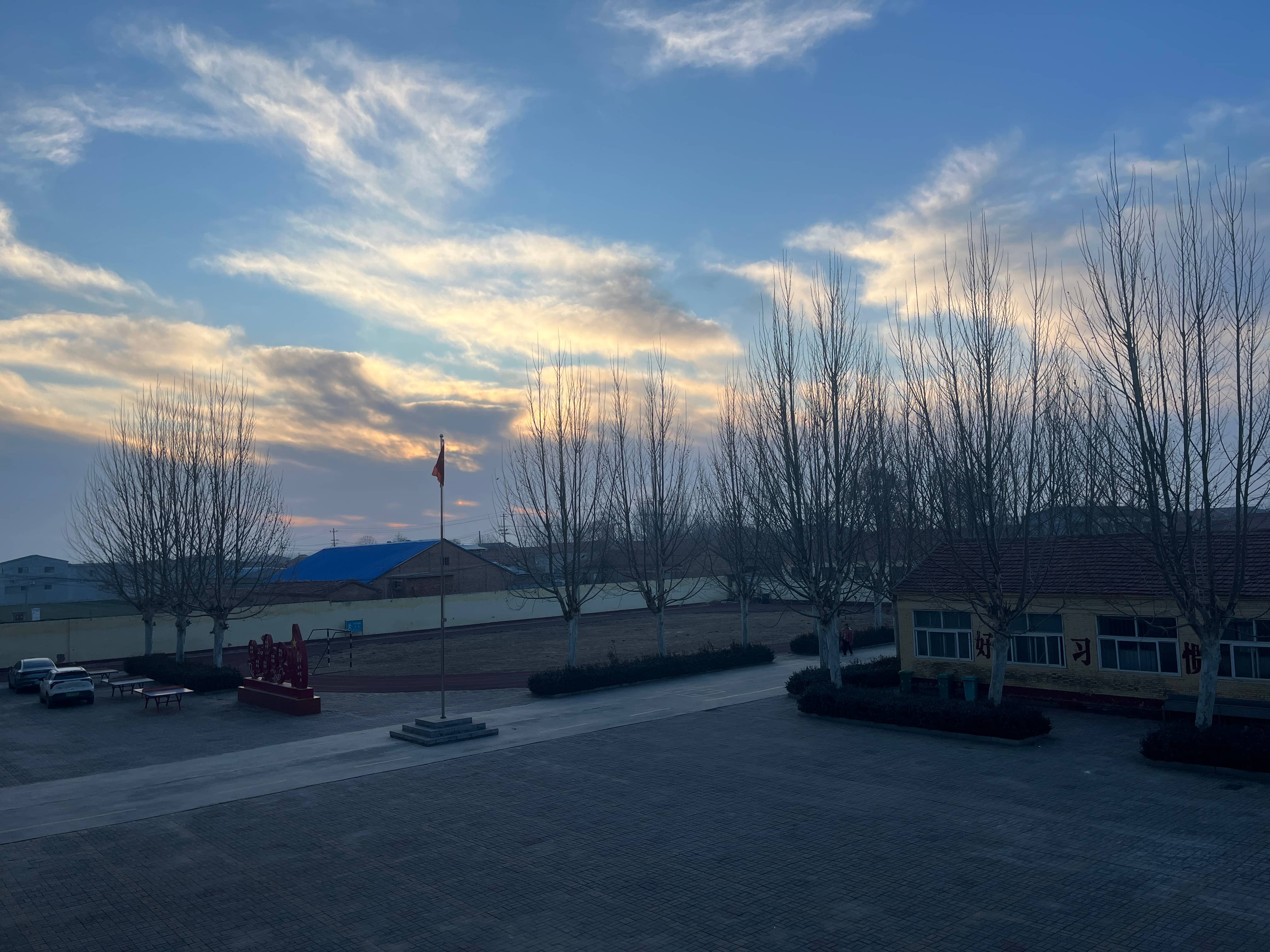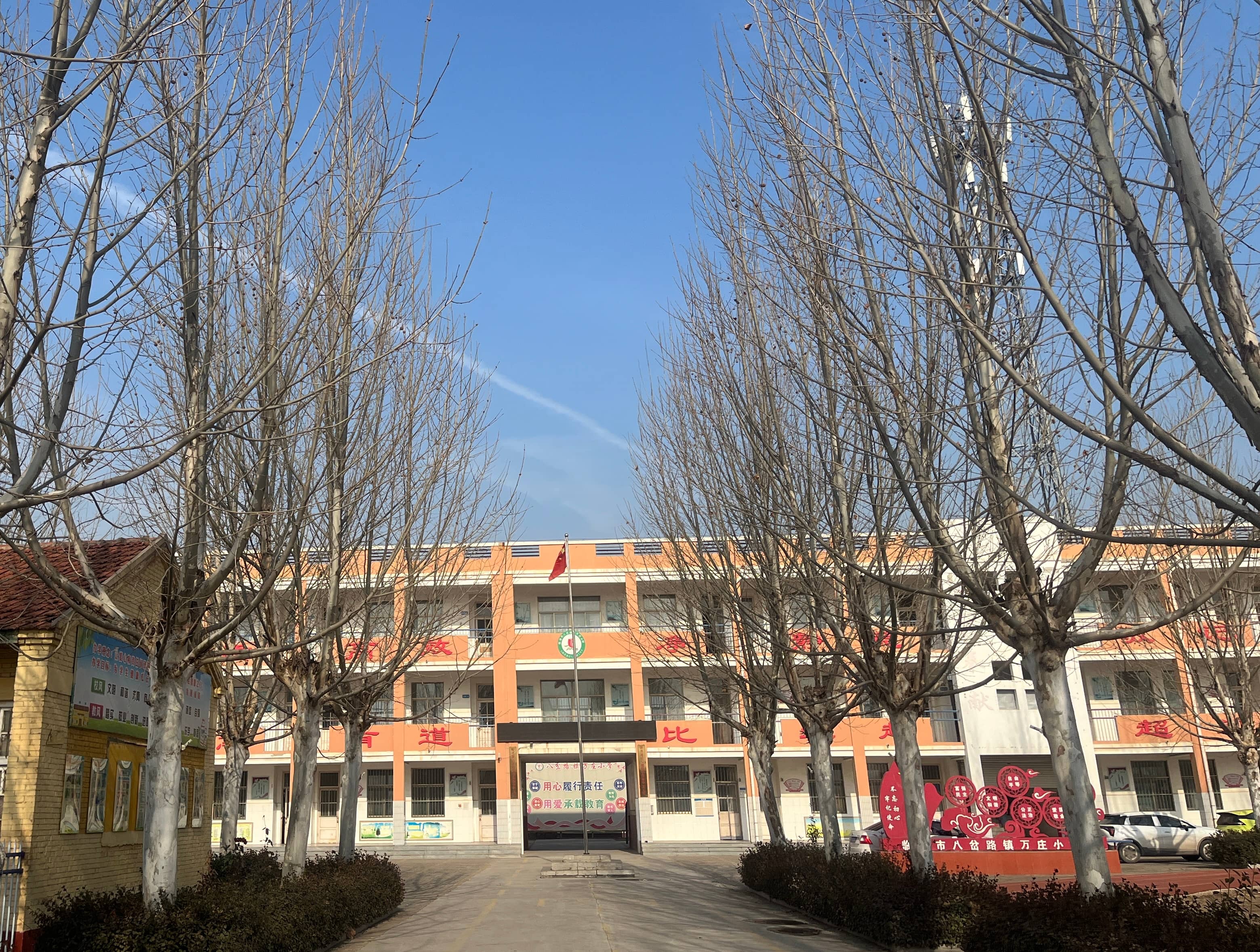 冬日的临清市八岔路镇万庄小学,金黄的楼体衬着澄澈蓝天,国旗在旗杆上迎风展。光秃的树枝勾勒出疏朗的轮廓,金边黄杨仍凝着绿意,校园里静悄悄的,却藏着等待春暖花开的生机,也守着乡村教育的温暖日常。(临清市八岔路镇万庄小学肖邦周拍摄)