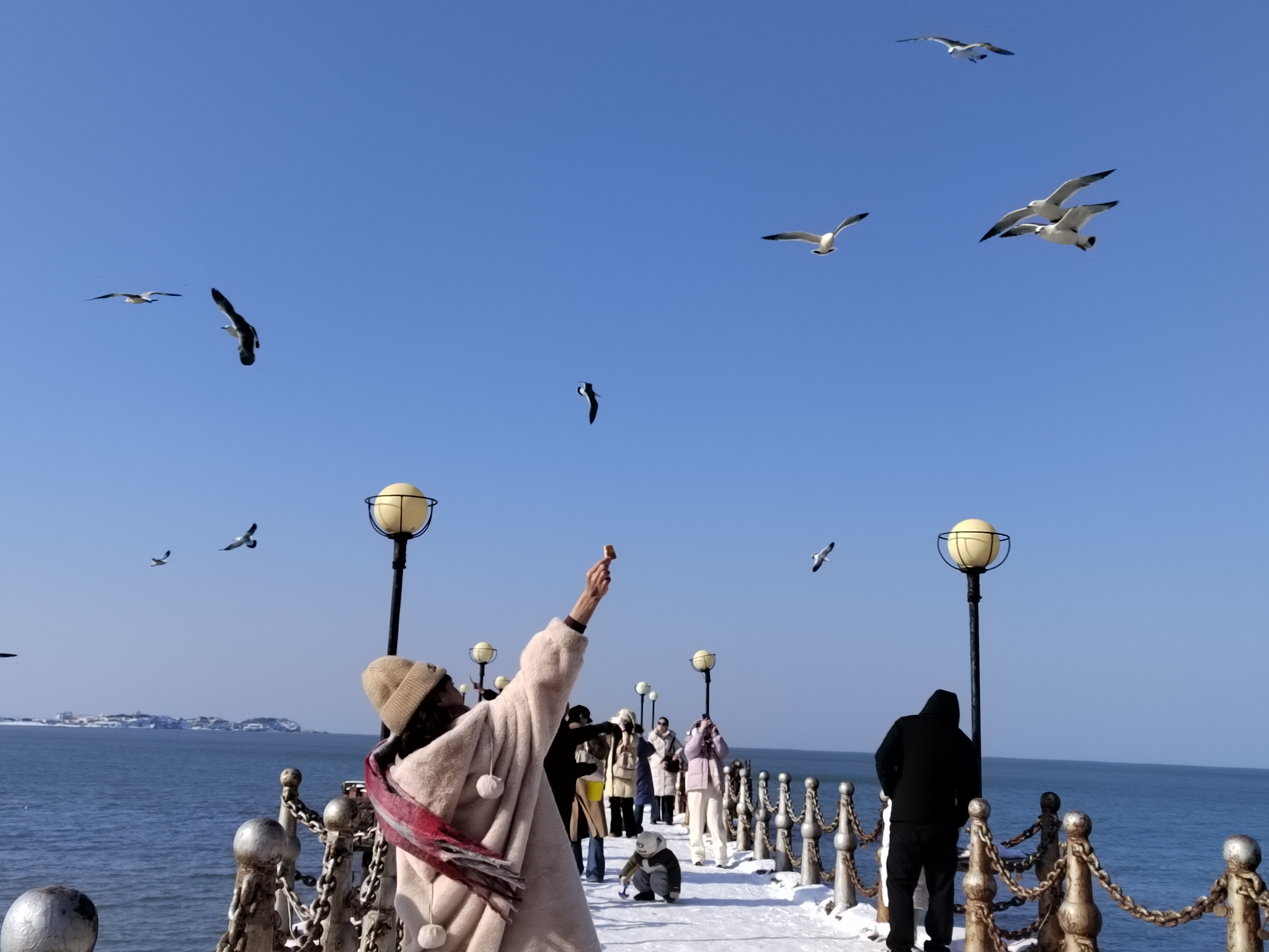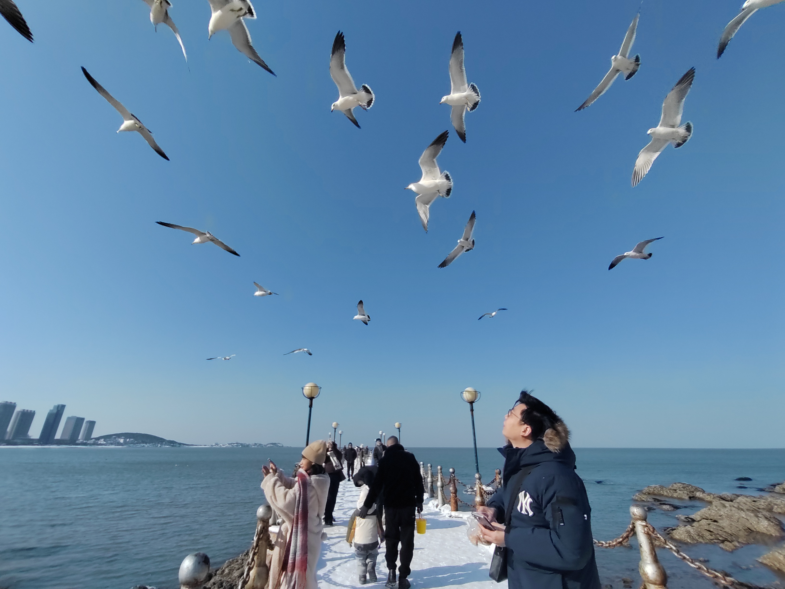 2026年1月12日,山东威海金海湾栈桥,游客在投喂海鸥。当细碎的面包屑抛向湛蓝的天幕,海鸥们从四面八方涌来。它们在半空划出优美的弧线,啄走食物的瞬间,羽翼扫过阳光,落下一片细碎的光影,成为海边特有的风景。(山东能源枣矿集团田陈煤矿魏忠富拍摄)