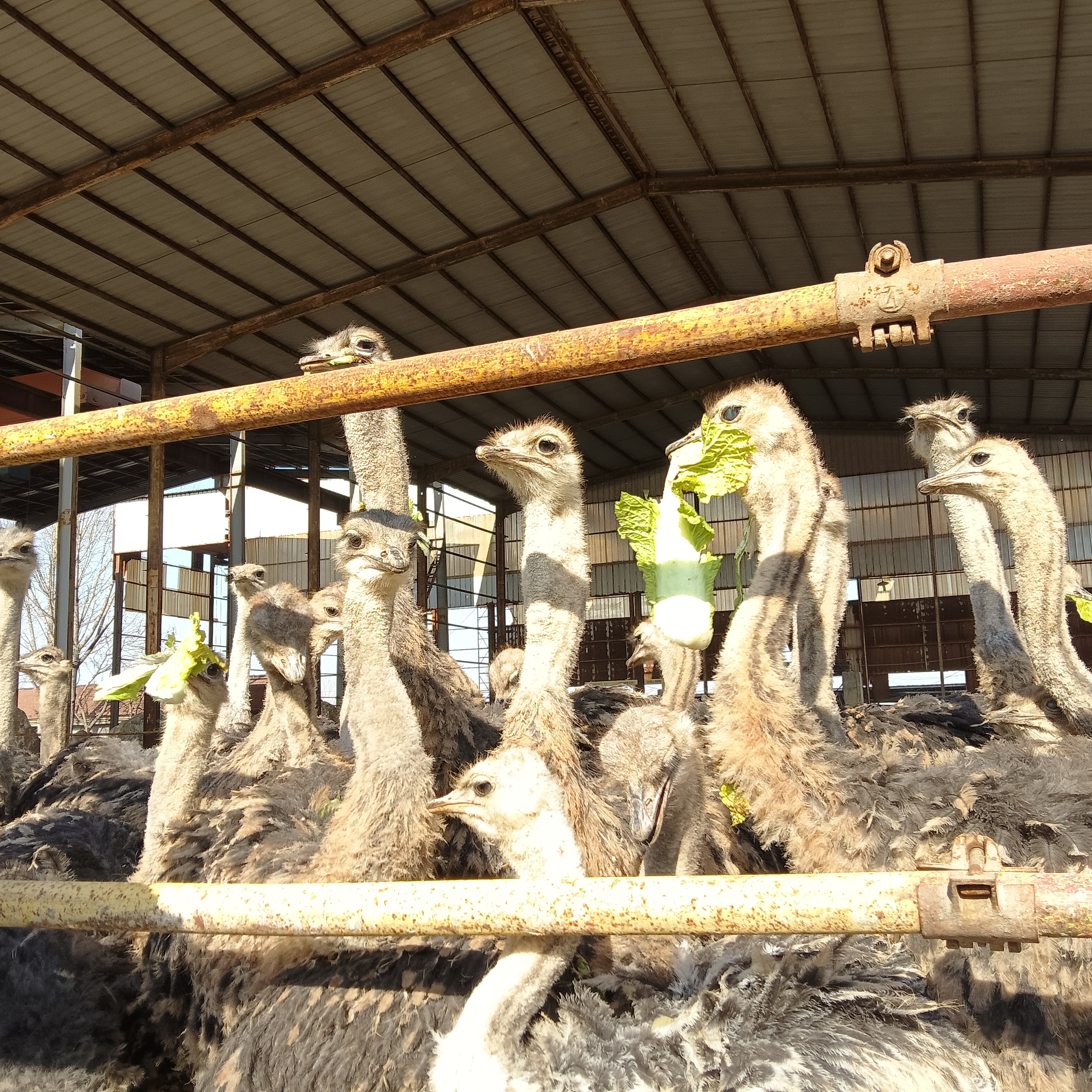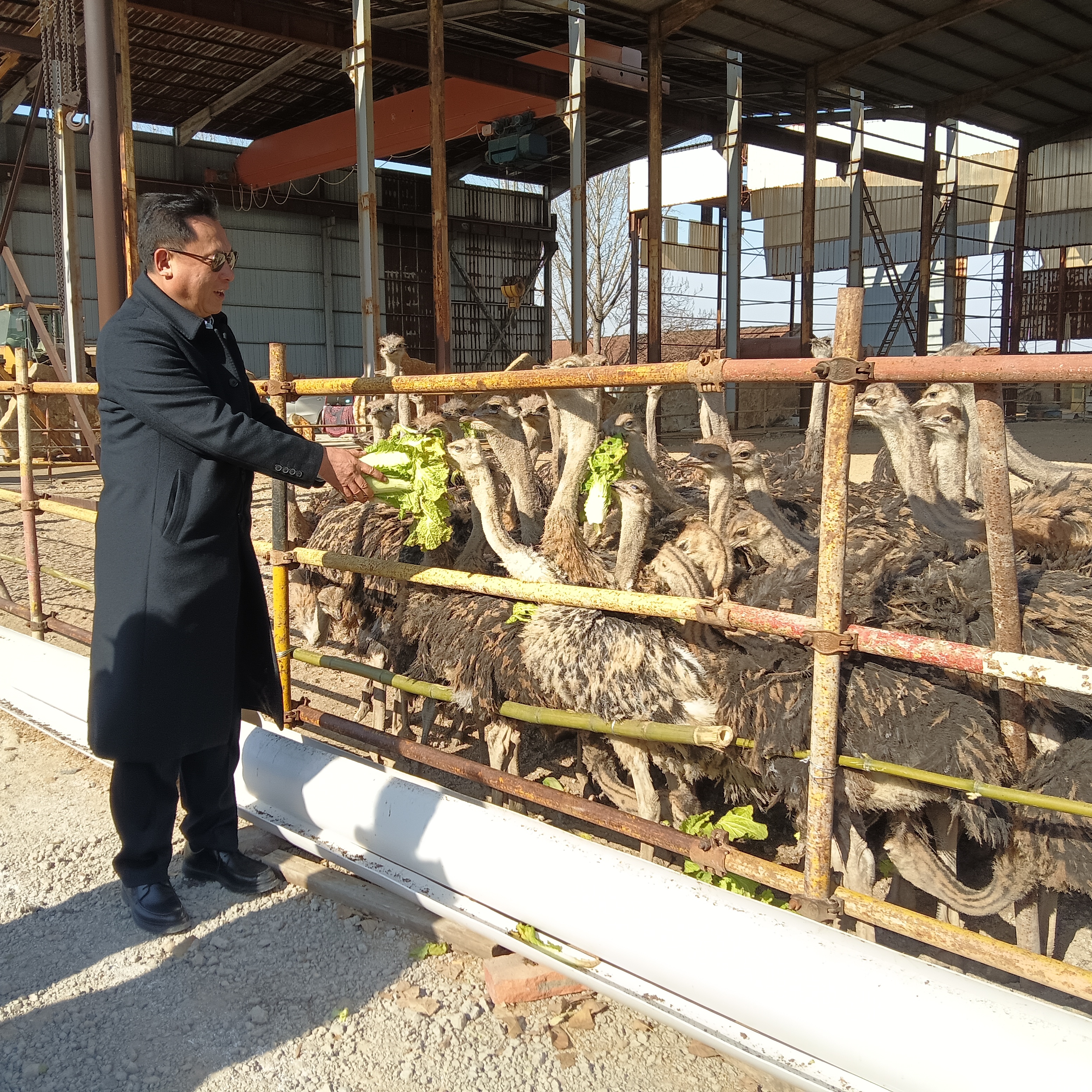 1月13日,山东省淄博市淄川区洪山镇蒲家庄村退役军人蒲长春正在喂鸵鸟。元旦刚过,蒲长春便在张店区四宝山街道闫高村盘活租赁了一处旧厂房,引进了100多只鸵鸟饲养。同时推出托管、领养、认养等灵活方式,吸引农户参与,并开展深加工业务,开发鸵鸟系列产品。(张白拍摄)