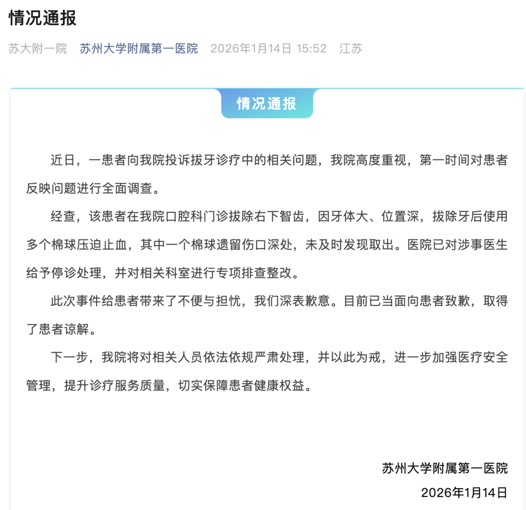 经查,该患者在我院口腔科门诊拔除右下智齿,因牙体大、位置深,拔除牙后使用多个棉球压迫止血,其中一个棉球遗留伤口深处,未及时发现取出。医院已对涉事医生给予停诊处理,并对相关科室进行专项排查整改。