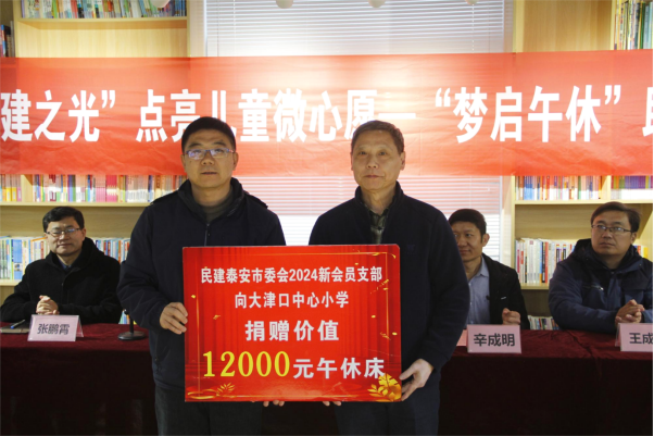 2016年1月14日,泰山景区大津口乡中心小学联合泰安民建市委会,开展“梦启午休”助学活动,为孩子们捐赠爱心午休床,用实际行动传递社会温情,乡党委副书记、政法委员、武装部长辛成明参加捐赠仪式。