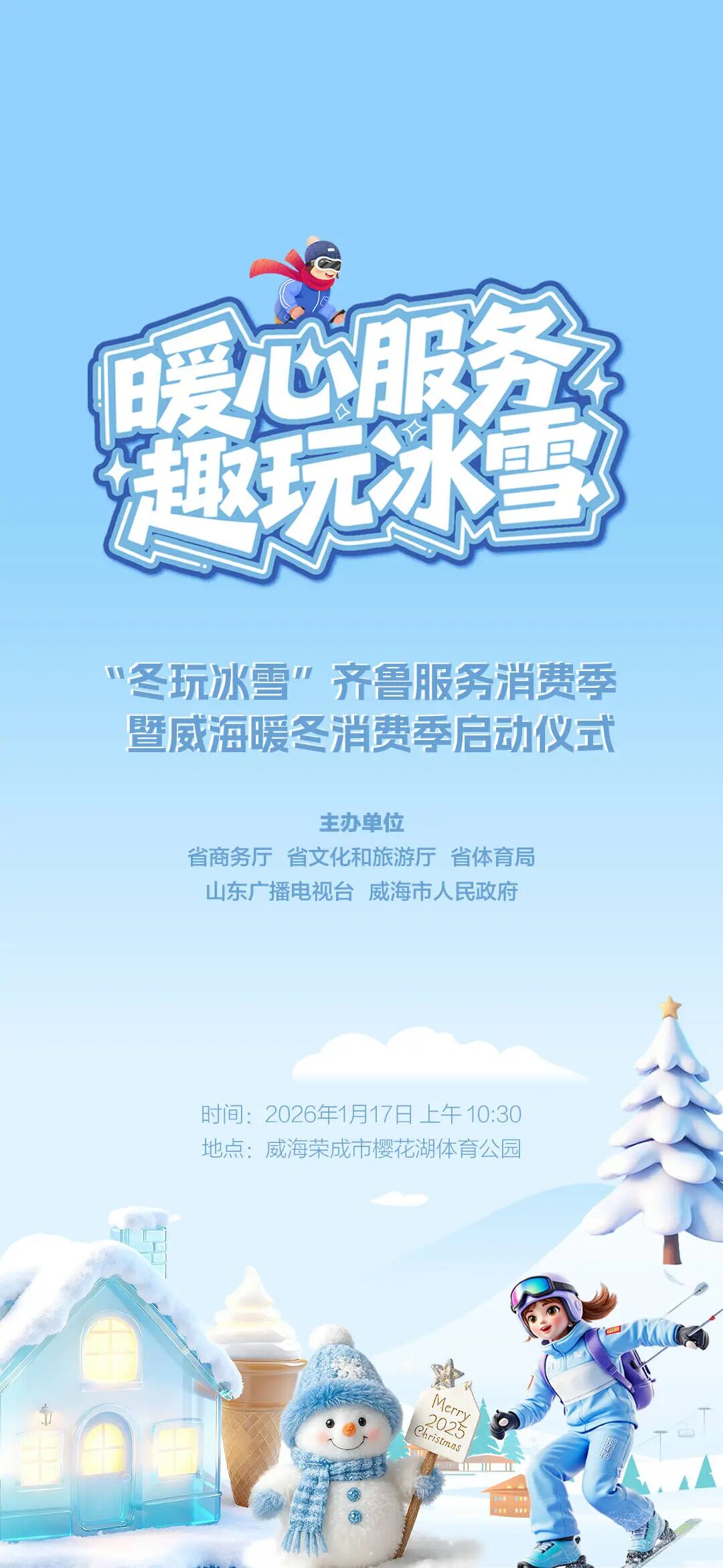 “冬玩冰雪”齐鲁服务消费季暨威海暖冬消费季启动仪式将于1月17日在威海荣成樱花湖体育公园盛大开启。活动期间将推出多层次优惠与利好政策,为全省消费者奉上一场冬日服务消费盛宴。