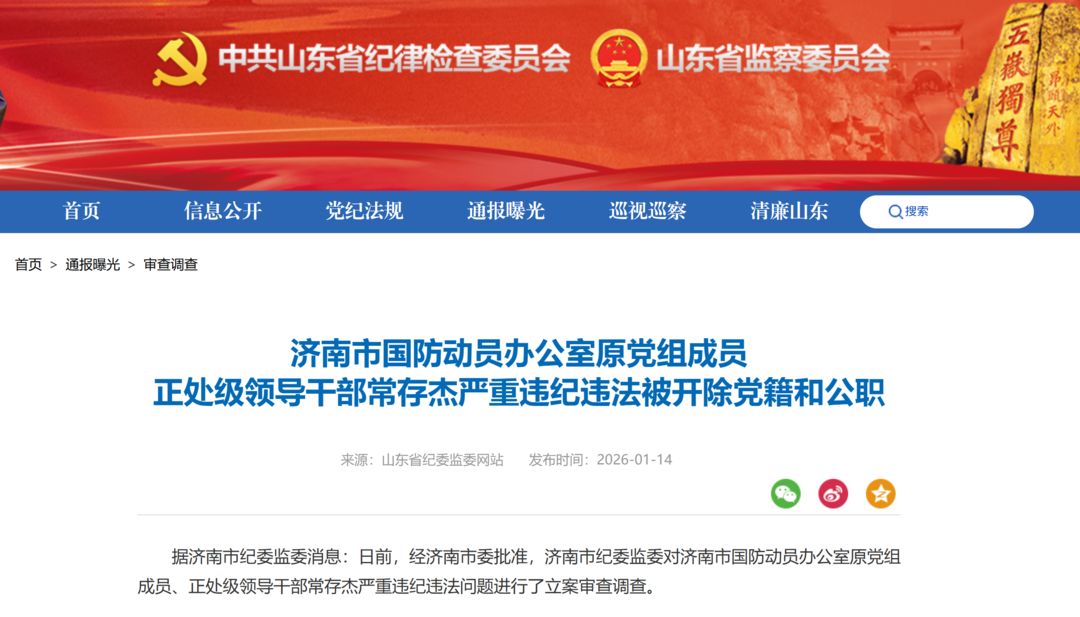 山东省纪委监委网站1月14日消息,济南市国防动员办公室原党组成员、正处级领导干部常存杰严重违纪违法被开除党籍和公职。
