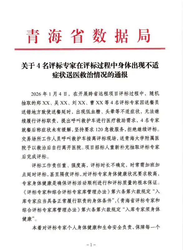 近日,青海省数据局发布通报,称4名评标专家因送餐延时引发低血糖、头晕,无法继续履职,被调整出省综合评标专家库。通报一出即引发全网热议,有人质疑“低血糖”是避事托词,有人猜测背后另有隐情。