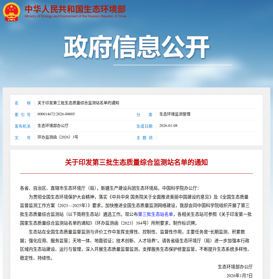 近日,生态环境部办公厅发布《关于印发第三批生态质量综合监测站名单的通知》(环办监测函〔2026〕3号),由山东省潍坊生态环境监测中心牵头、中国农业科学院蔬菜花卉研究所(中国农业科学院寿光蔬菜研发中心)为主站点,联合潍坊学院、潍坊市生态环境局和潍坊市自然资源和规划局申报的山东潍坊站(农田)成功入选,这标志着潍坊市正式纳入全国生态质量监测网络。