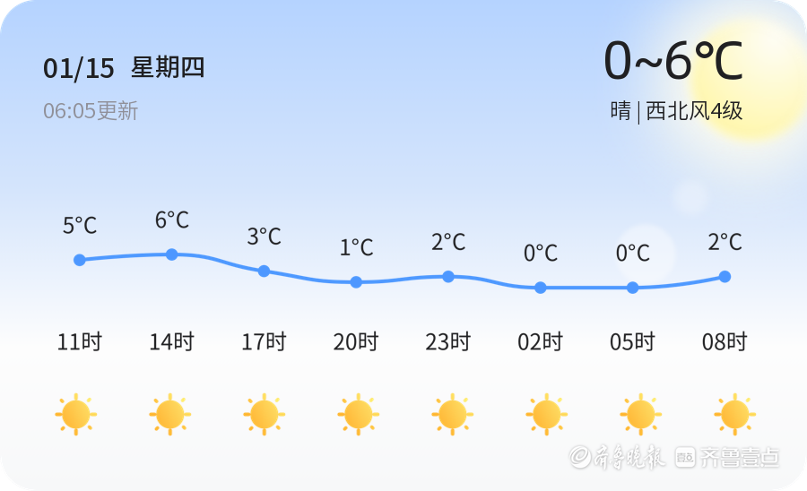 今天是1月15日,星期四,农历十一月廿七。威海市迎来晴好天气,气温在0℃到6℃之间,西北风4级,空气湿度57%,PM2.5指数为98,空气质量良好。各区天气状况一致,均为晴朗天气,适合市民户外活动。