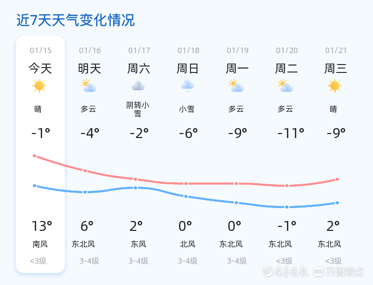 今天是2026年1月15日,星期四,农历十一月廿七。德州迎来了一天的晴朗天气,气温范围在-1℃至13℃之间。东北风1级,空气湿度为92%,PM2.5指数为214。各区的天气情况基本一致,均为晴朗,适合市民外出活动。