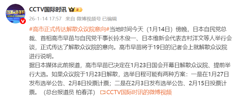 据CCTV国际时讯:当地时间1月14日傍晚,日本自民党总裁、首相高市早苗与自民党干事长铃木俊一、日本维新会代表吉村洋文等人举行会谈,正式传达了解散众议院的意向。高市早苗将于19日的记者会上就解散众议院进行说明。