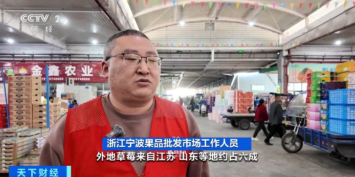 浙江宁波果品批发市场工作人员:目前本地草莓供应量约占四成,外地草莓来自江苏、山东等地约占六成,价格比刚上市时下降50%。