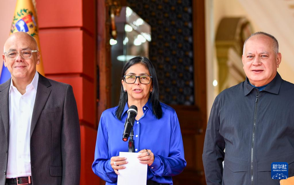 14日,在委总统府观花宫,委内瑞拉代总统罗德里格斯(中)参加新闻发布会。