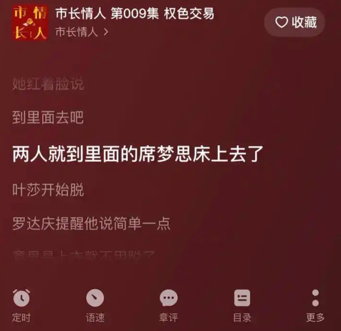 新黄河调查中还发现,“番茄畅听”平台内存在大量标题与简介带有明显擦边色彩的有声书作品。例如,《我与表嫂的秘密》《下乡支教,被糙汉大叔撩到腿软》《市长情人》等作品,仅从标题已传递出暧昧、低俗倾向。试听过程中,记者发现该作品在叙述市长的官场工作与个人生活时,多处内容涉嫌打擦边球,情节设计刻意游走在敏感边缘。