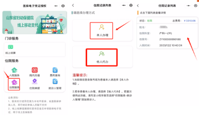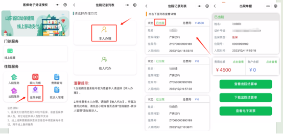 4、查看出院单据 点击住院单据按钮,选择本人或他人代办,选择要查看的出院记录,进入出院单据页面。可查看、下载医保统筹结算单,查看电子发票等。