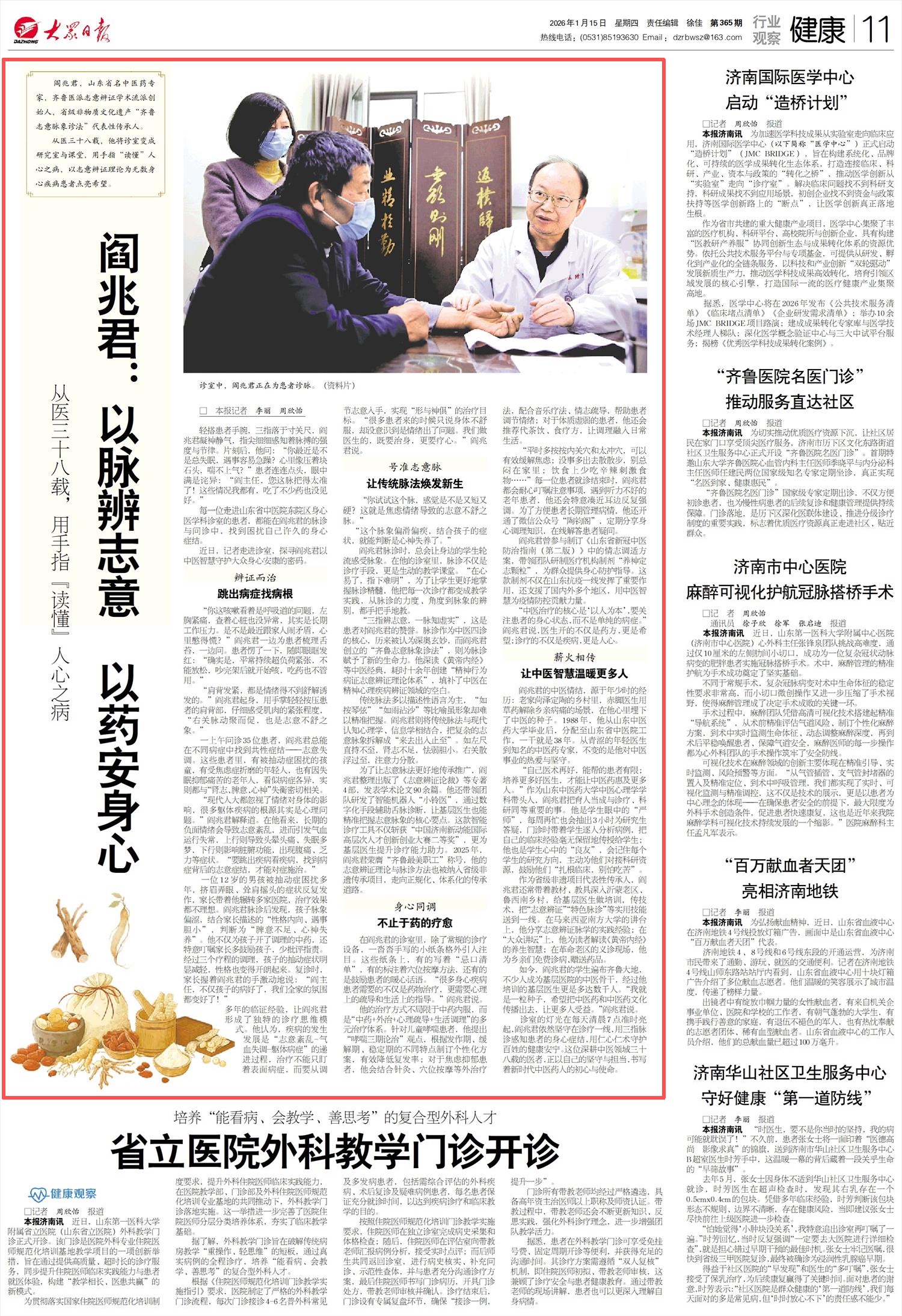 大众日报《健康版》|阎兆君:以脉辨志意 以药安身心