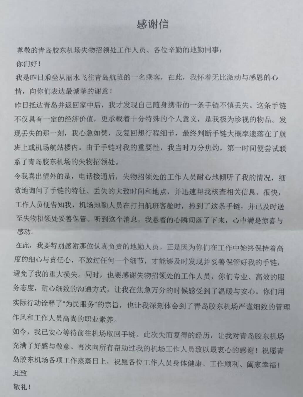 “它不仅仅是一件物品,更像是我生命的一部分,承载着无法复刻的回忆。”2026年1月5日,一封感谢信送到了青岛胶东国际机场失物招领处的工作人员手上。