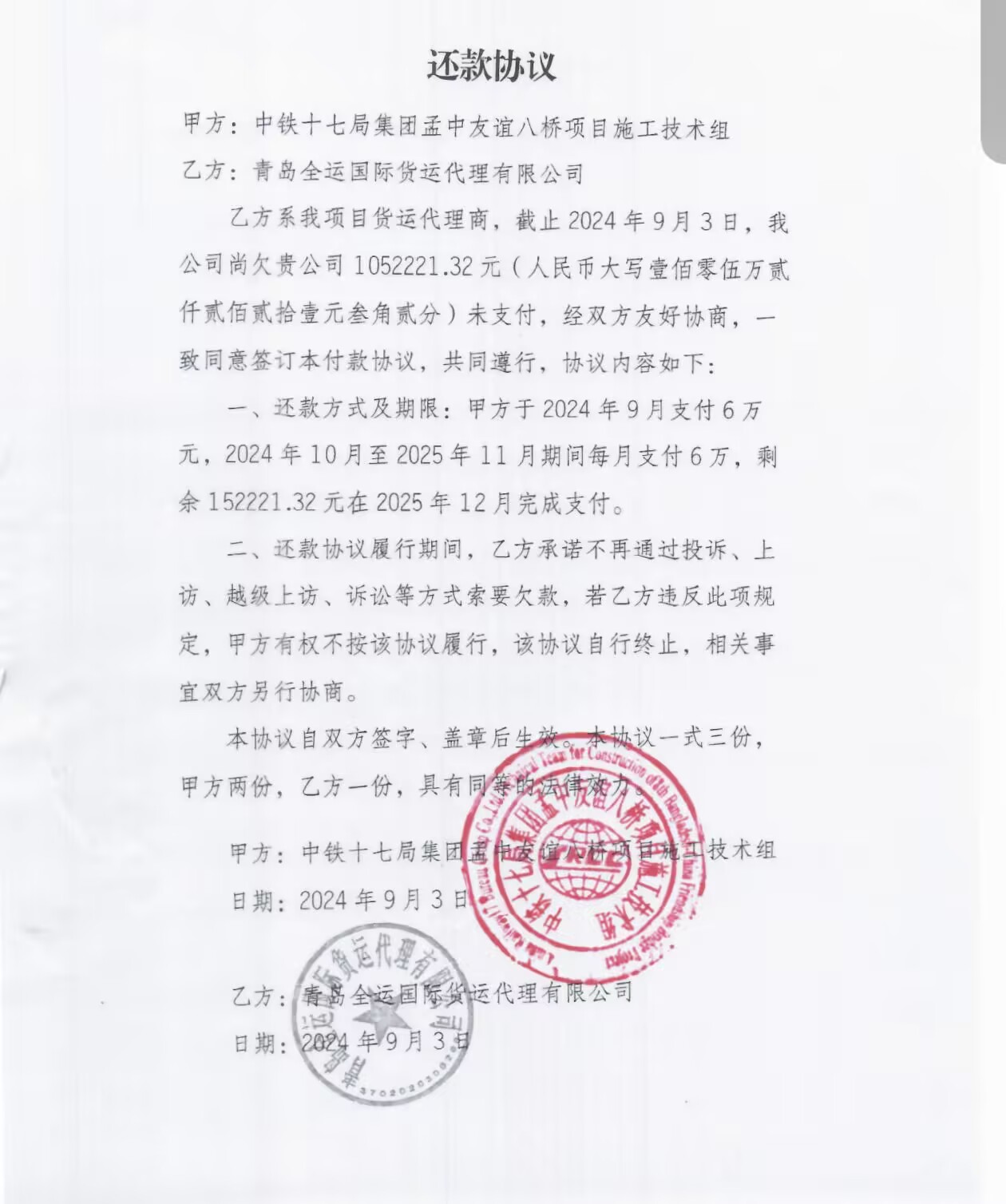 于女士提供的《海外项目物资海运合同》显示,甲方:中铁十七局集团有限公司,法定代表人陈宏伟,职务为董事长,合同的第八条结算及付款方式明确约定,货物安全到达目的港,经甲方验收合格无任何遗留问题后,甲方应在确认费用清单并收到准确无误的全额增值税发票后,60个工作日全额支付所有费用,合同签署日期为2019年5月20日。“第一张发票是2020年4月开具的,最后一张发票开票日期是2022年2月。”于女士表示,所有发票都按照要求开具完毕了,对方对运费的总金额也没有任何异议,但就是不结款。“为此,我们2024年9月去往了中铁十七局集团太原总部,当时还达成了一项还款协议,约定中铁十七局2024年9月起至2025年11月每月支付6万元,剩余部分在2025年12月完成支付,但对方仅仅在第一个月还款6万元后,便再也没有履约。”于女士说,因这笔运费迟迟不到账,对公司的正常经营和资金周转都带来了不良影响。
