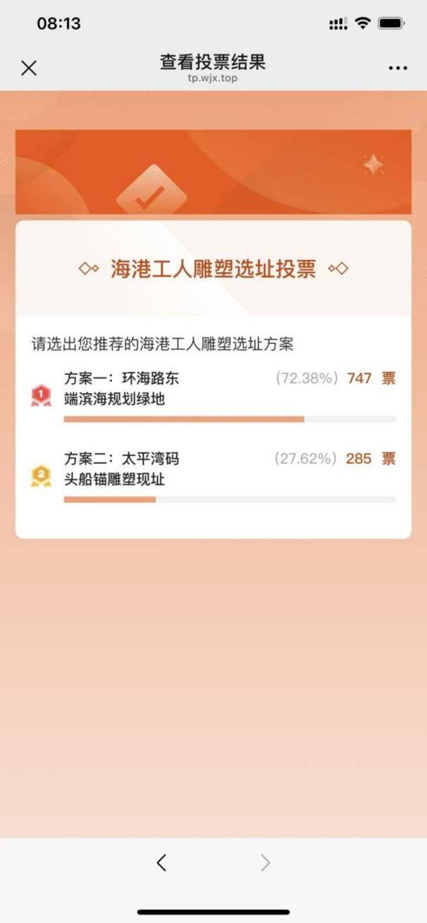 本次公众意见征集共收到有效扫码投票1032票。其中:方案一(环海路东端滨海规划绿地)获得747票,占总票数的72.4%;方案二(太平湾码头船锚雕塑现址)获得285票,占总票数的27.6%。通过投票后方留言显示,支持方案一的市民普遍认为,该选址距离原雕塑位置较近,视野开阔、与滨海环境融合度高、利于永久安放,具备打造标志性滨海文化景点的良好条件。