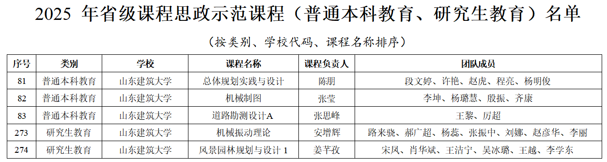 近日,山东省高等学校课程思政研究中心先后公布2025年省级课程思政示范课程建设名单及山东省本科高校黄河重大国家战略课程思政优秀案例名单,山东建筑大学推荐的5门课程全部获批省级课程思政示范课程,提交的5项课程思政优秀案例全部入选优秀案例名单。上述成果的取得,是学校深入贯彻落实立德树人根本任务、持续推进课程思政建设与国家战略深度融合的重要成果。