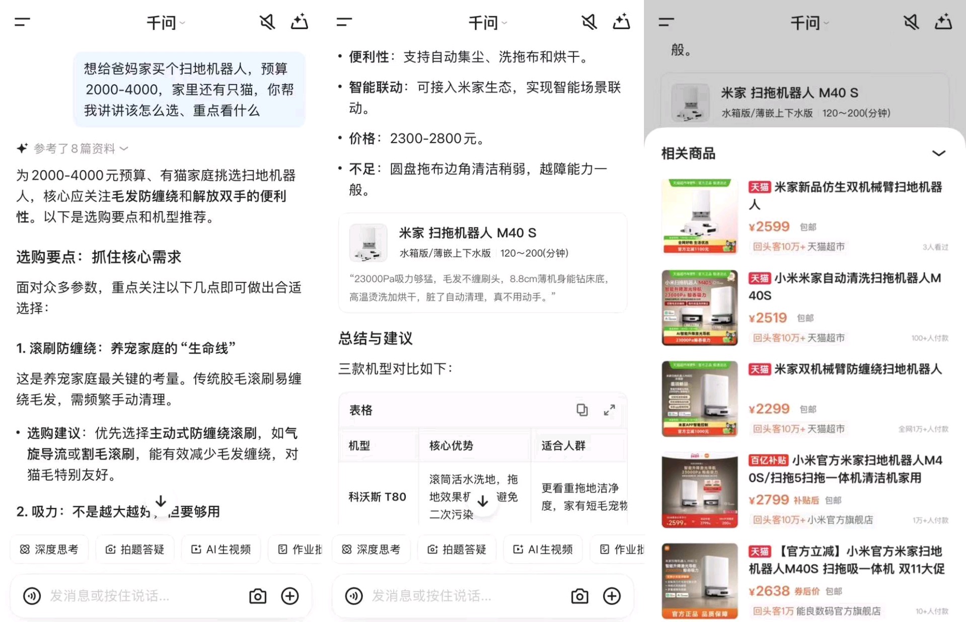 面对“想给爸妈家买个扫地机器人,预算 2000–4000,家里还有只猫”这样模糊意图,千问App能精准推理出“防缠绕”、“高温杀菌”等隐含刚需,并基于真实交易数据给出客观推荐,省去了用户查攻略的繁琐。