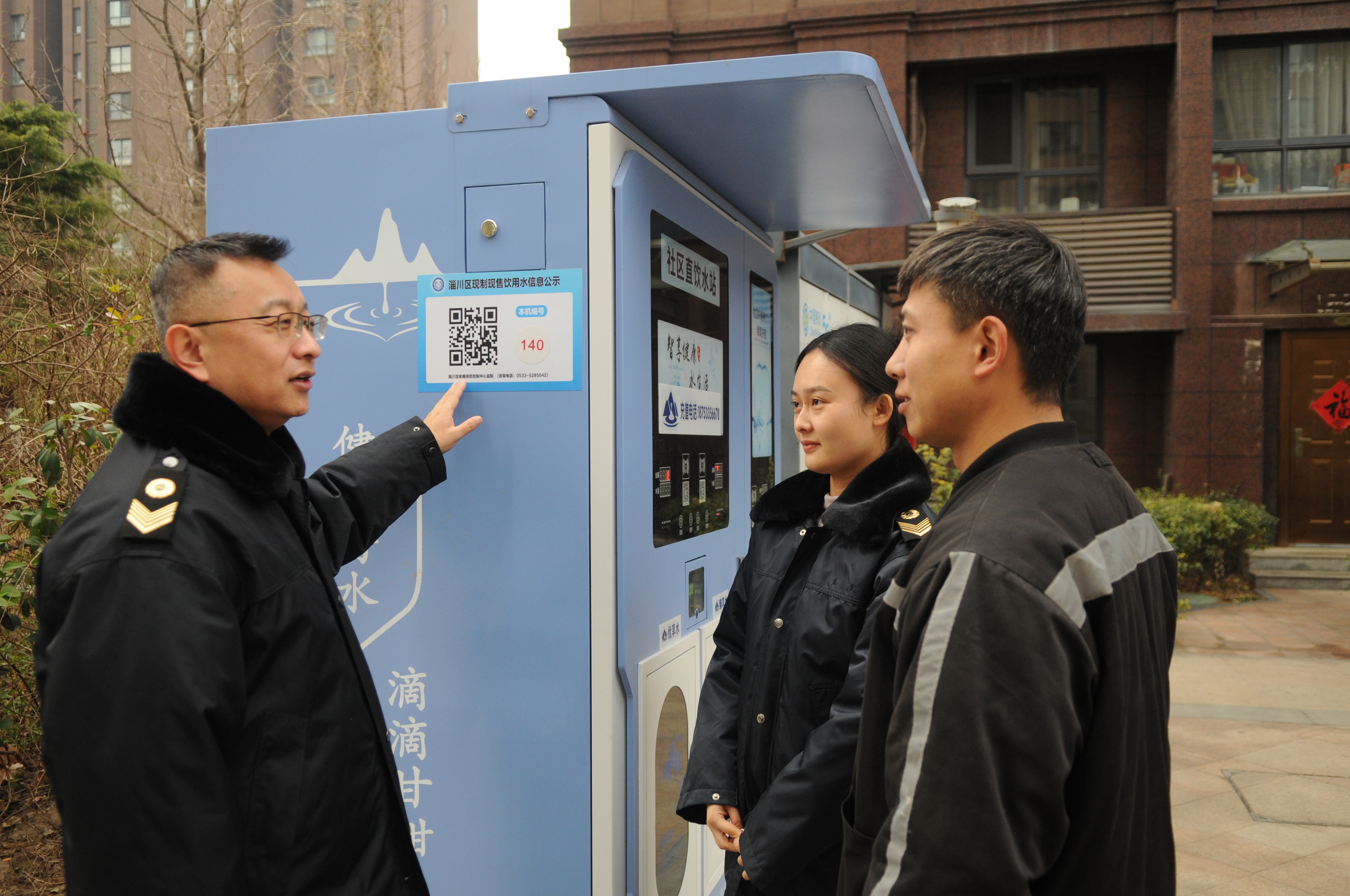 1月14日,山东省淄博市淄川区疾病预防控制中心工作人员正在吉祥豪苑社区直饮水站前,查看现制现售饮用水信息公示牌。淄川区已有376台直饮水机有了二维码信息公示牌。针对直饮水站现制现售饮用水信息公示牌手工填写、字迹不清、易损坏等弊端,淄川区疾病预防控制中心开发出现制现售水信息公示系统,市民只需要扫一扫二维码,输入直饮水机编号,维护记录、滤芯更换、水质检测等信息就可马上显现出来。