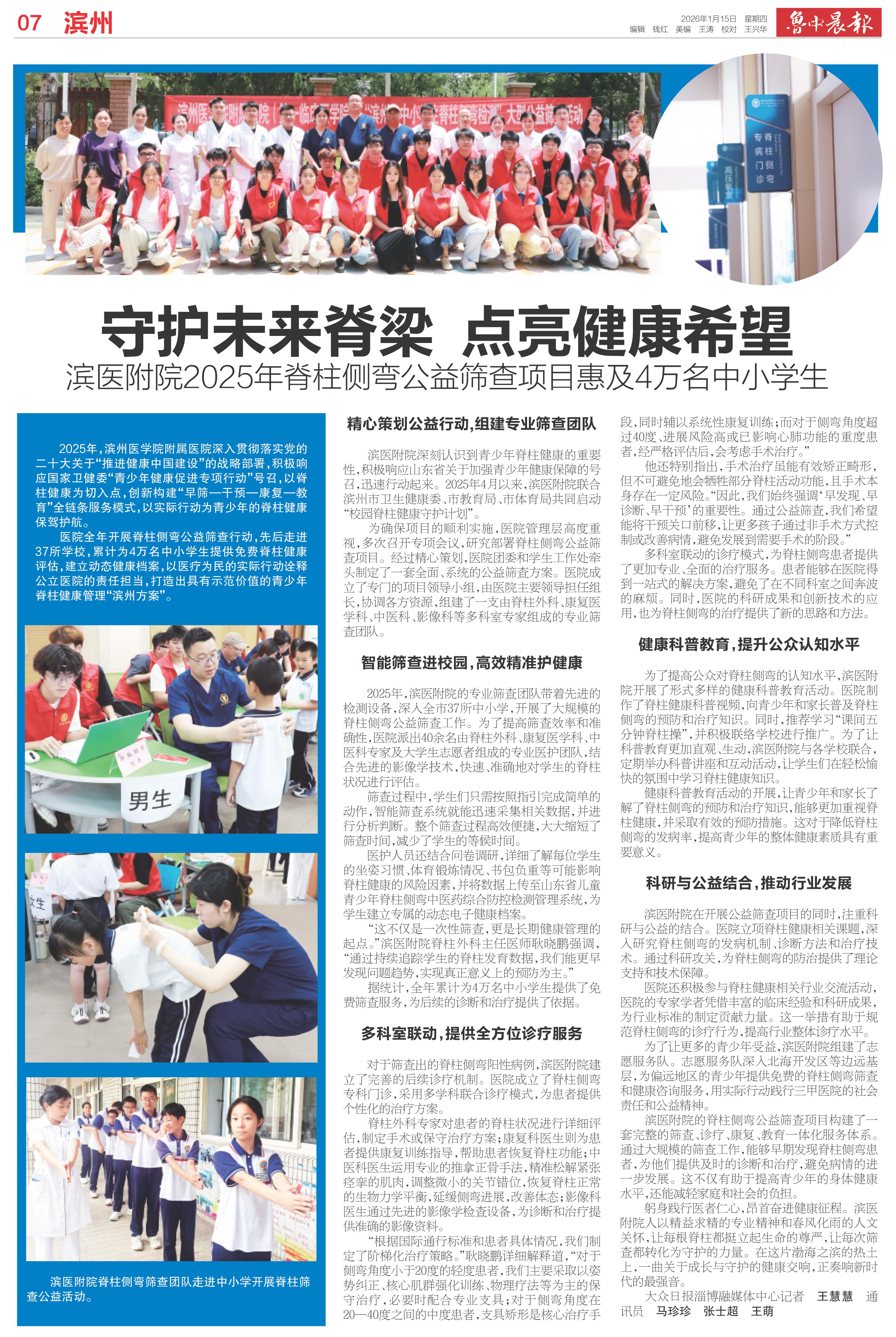 守护未来脊梁 点亮健康希望 滨医附院2025年脊柱侧弯公益筛查项目惠及4万名中小学生