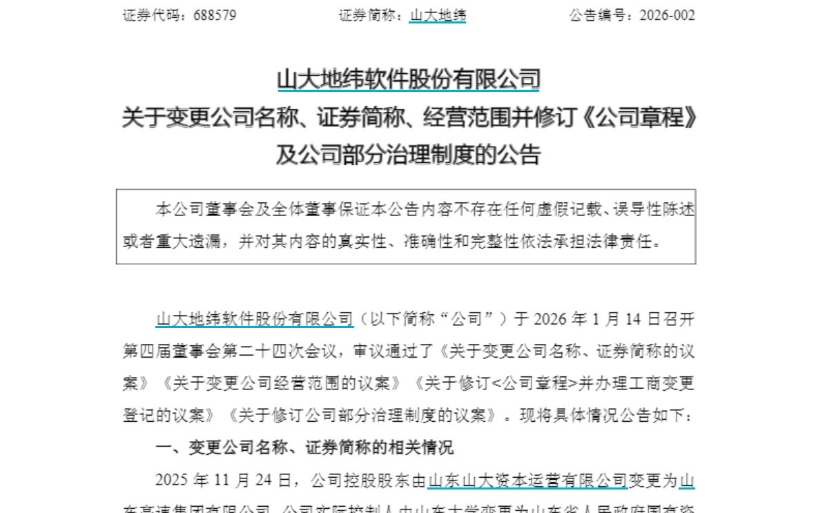 1月14日,山大地纬(688579.SH)发布多份公告,披露了拟变更公司名称、预计2026年度日常关联交易、董事会换届选举等相关公告。