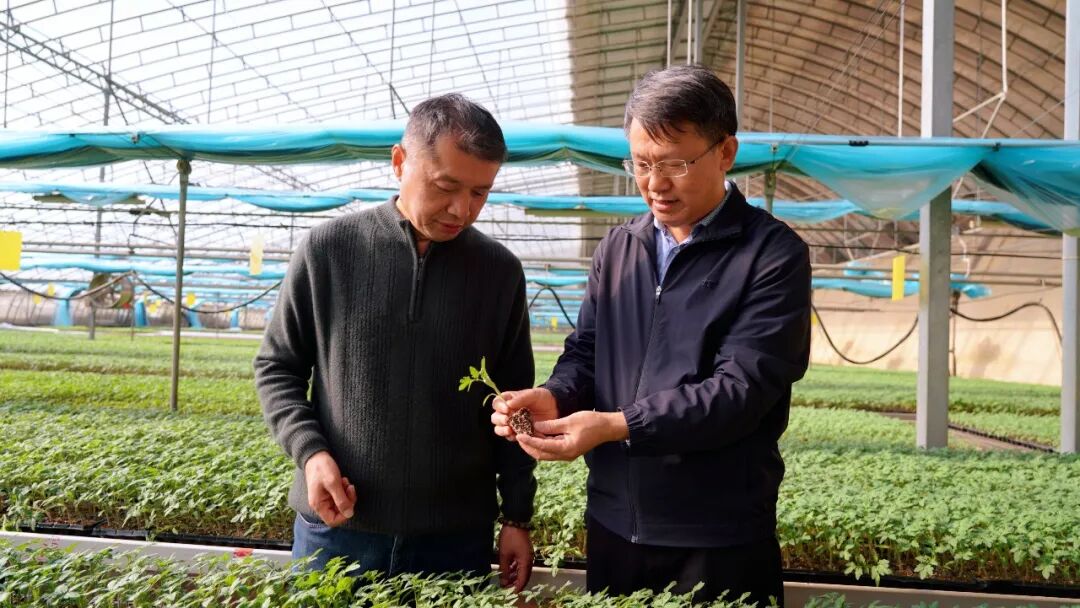 2026年1月,高中强(右)到济南市济阳区山东安信种苗股份有限公司调研蔬菜智慧育苗。