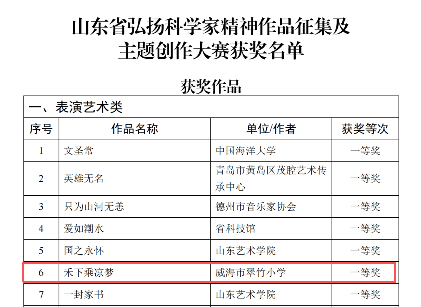 近日,山东省弘扬科学家精神作品征集及主题创作大赛获奖名单正式揭晓,威海市翠竹小学编排的戏剧剧目《禾下乘凉梦》凭借深刻的主题内涵、生动的舞台演绎,荣获表演艺术类一等奖。