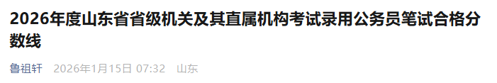 1月15日,山东省公务员局发布2026年度山东省省级机关及其直属机构考试录用公务员笔试合格分数线和2026年度山东省省级机关及其直属机构考试录用公务员面试公告,详情——