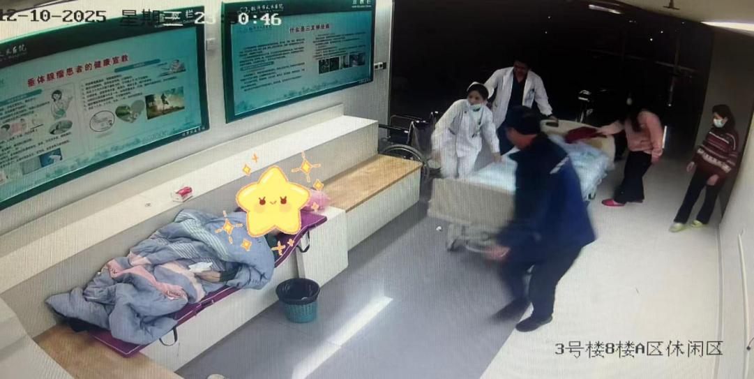 然而,眼前的一幕,让空气瞬间凝滞——休闲区的角落,家属正蜷缩在躺椅上,面色惨白,看上去格外虚弱。季建英立刻上前查看,家属微弱地应答“头晕”。她不敢耽搁,当即拨通了值班医生冯帆的电话。可转身再看时,家属已双目紧闭,呼之不应。