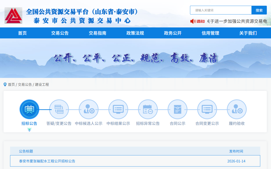 1月14日,泰安市公共资源交易中心发布泰安市夏张输配水工程公开招标公告,具体内容如下: