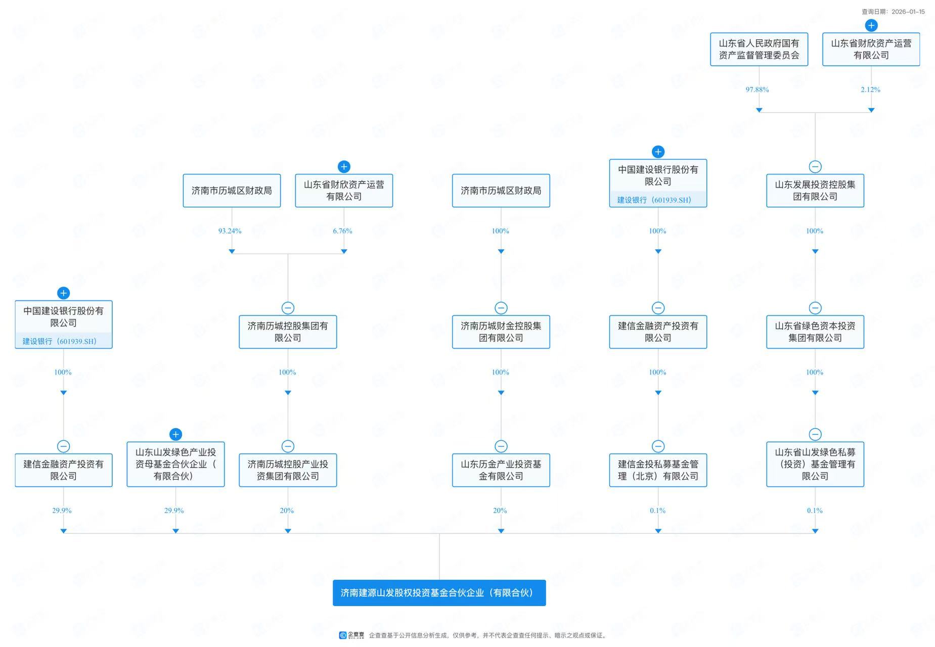 企查查信息显示,该基金已于2025年12月31日落地济南市历城区。出资人采用“双GP”模式,由建信金投私募基金管理(北京)有限公司与山东省山发绿色私募(投资)基金管理有限公司共同担任执行事务合伙人。