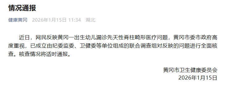 近日,网民反映黄冈一出生幼儿漏诊先天性脊柱畸形医疗问题,黄冈市委市政府高度重视,已成立由纪委监委、卫健委等单位组成的联合调查组对反映的问题进行全面核查。核查情况将适时通报。