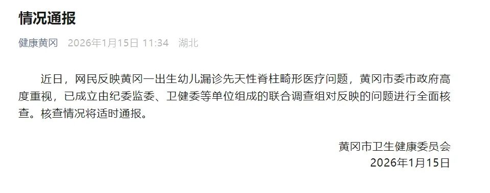 2026年1月15日,湖北省黄冈市卫生健康委员会发布情况通报:近日,网民反映黄冈一出生幼儿漏诊先天性脊柱畸形医疗问题,黄冈市委市政府高度重视,已成立由纪委监委、卫健委等单位组成的联合调查组对反映的问题进行全面核查。核查情况将适时通报。(“健康黄冈”微信公众号)