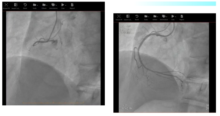 在完成必要的术前准备以及沟通后,由急诊科直接转运至心脏导管室,心内科刘茂月副主任医师主刀,医护团队凭借娴熟的技术,快速通过导丝、球囊扩张,成功于病变处精准植入两枚药物洗脱支架,血流瞬间恢复,患者的心脏得到了及时、有效的再灌注。手术过程顺利,术后患者生命体征逐渐趋于平稳。