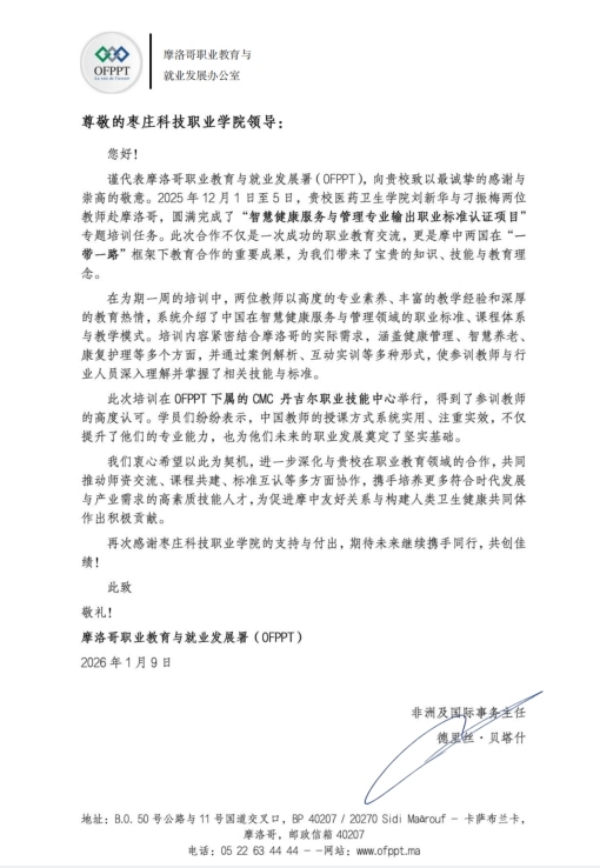 近日,摩洛哥职业教育与就业发展署(OFPPT)向学院发来感谢信,高度评价医药卫生学院刘新华、刁振梅两位教师于2025年12月1日至5日赴摩开展的“智慧健康服务与管理专业输出职业标准认证项目”专题培训。此次培训是中摩在“一带一路”教育合作框架下的重要实践,标志着中国职业教育标准体系成功“出海”。