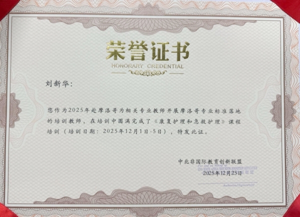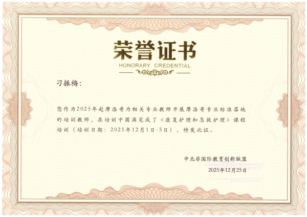 培训期间,刘新华、刁振梅教师还荣获中北非国际教育创新联盟颁发的荣誉证书,表彰其在《康复护理和急救护理》课程培训中的卓越贡献。