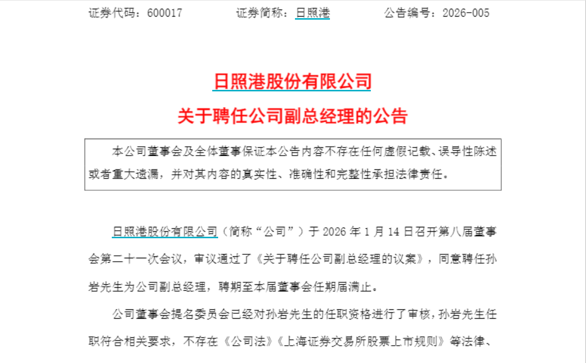 1月14日晚,日照港(600017.SH)发布公告称,聘任孙岩为公司副总经理,聘期至第八届董事会任期届满止。