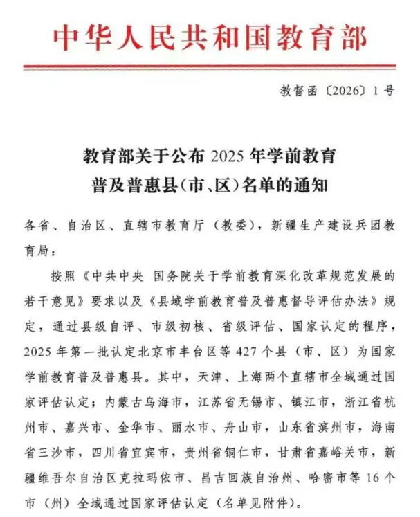 此次教育部公布的2025年第一批学前教育普及普惠县(市、区)名单中,全国共427个县(市、区)通过认定,其中山东共有26个县(市、区)入选。名单如下——