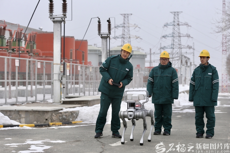 1月14日,在乌鲁木齐220千伏老满城变电站内,国网乌鲁木齐供电公司运维人员和一台智能机器人在对变电设备进行巡检。