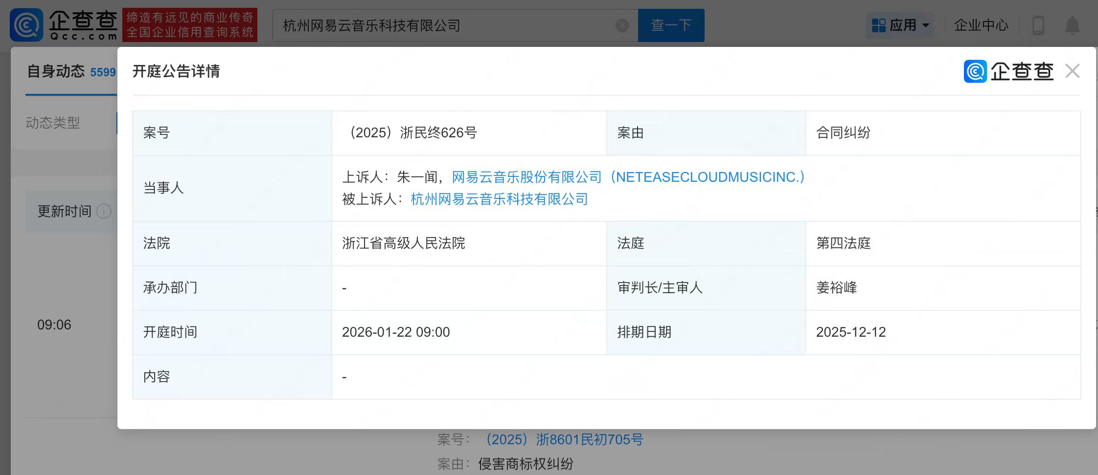 企查查APP显示,近日,杭州网易云音乐科技有限公司作为被上诉人新增一则开庭公告信息,上诉人为朱一闻、网易云音乐股份有限公司(NETEASE CLOUD MUSIC INC.),案由为合同纠纷,案件计划将于1月22日在浙江省高级人民法院开庭。
