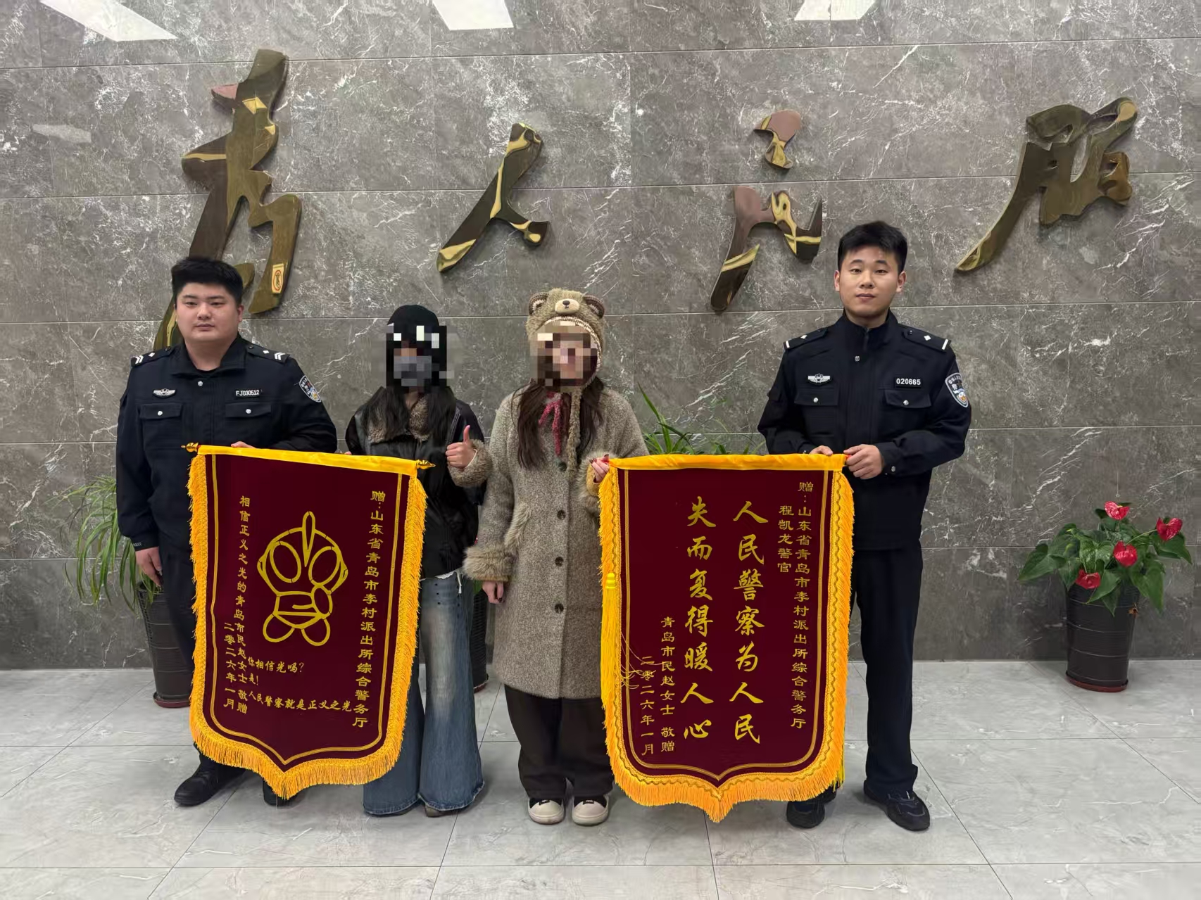 1月10日上午,赵女士携带两面锦旗来到李村派出所,一面写有“人民警察为人民 失而复得暖人心”,另一面印着一个奥特曼,并配文“你相信光吗?人民警察就是正义之光”,对民警帮助找回丢失的电动车表示感谢。“警察同志就像‘奥特曼’一样,给我们带来安全和光!”赠送锦旗的赵女士笑着解释道。